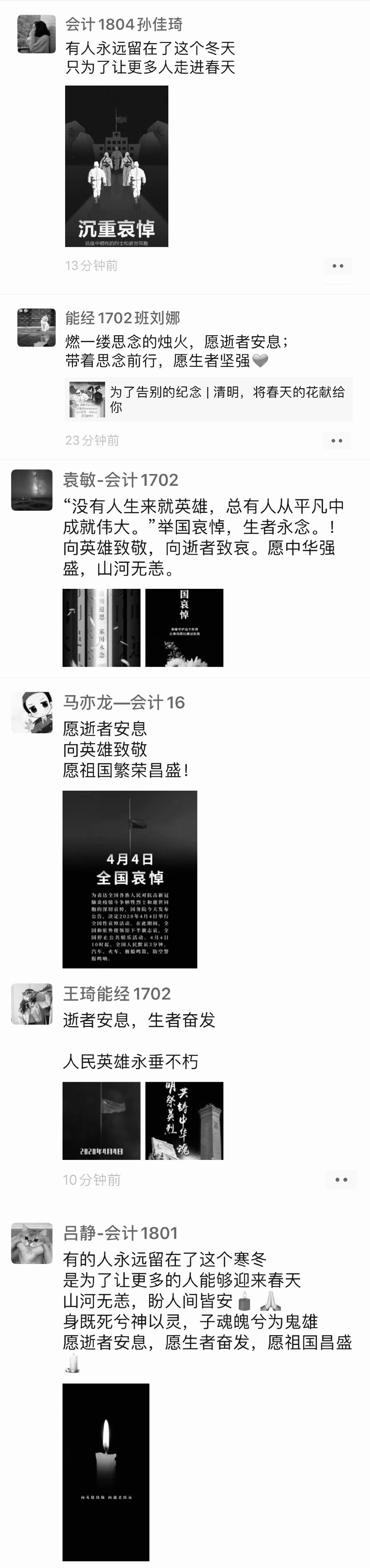 会计1804杨柳青同学说到,“有不知道多少的战士为了保护我们而英勇牺牲!我们无法用言语来表达,4月4日是我们的传统节日清明节,我们通过哀悼的方式,向抗疫英雄们致敬!”市营1801张迈同学表示“病毒侵扰,疫情不断。在无情的病毒面前,无数的医护人员选择了逆行、选择了向死而生、选择了用生命去守护生命。在此清明之际,我在心中为你们祈福。山花烂漫时,向英雄致敬!”