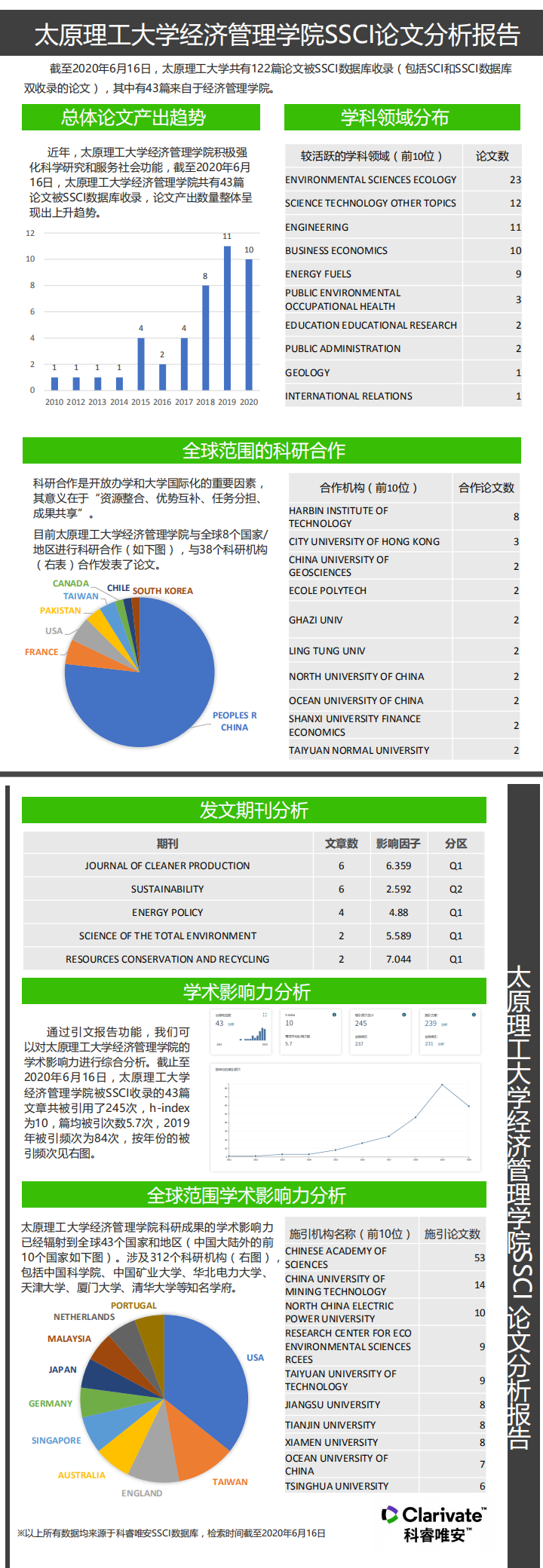 通过报告分析,截至2020年6月16日,新葡的京官网共有122篇论文被SSCI数据库收录(包括SCI和SSCI数据库双收录的论文),其中有43篇来自于350vip8888新葡的京集团,占比为35.25%,发文较活跃的学科为:生态环境学、工程学、商业经济学、能源燃料等方面,呈现出较高的学科交叉融合的态势。