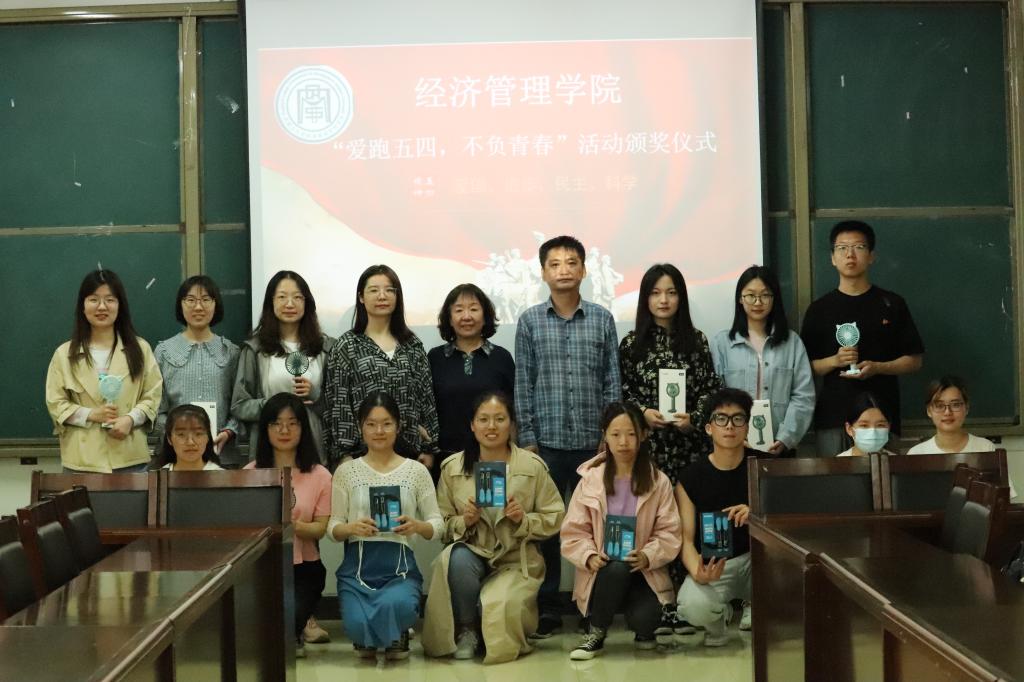 5月25日中午,350vip8888新葡的京集团在经管楼229会议室召开“爱跑五四、不负青春”活动总结暨颁奖仪式,院党委书记李玮、副书记杨振东、团委书记郝晓飞以及获奖学生代表参加活动。