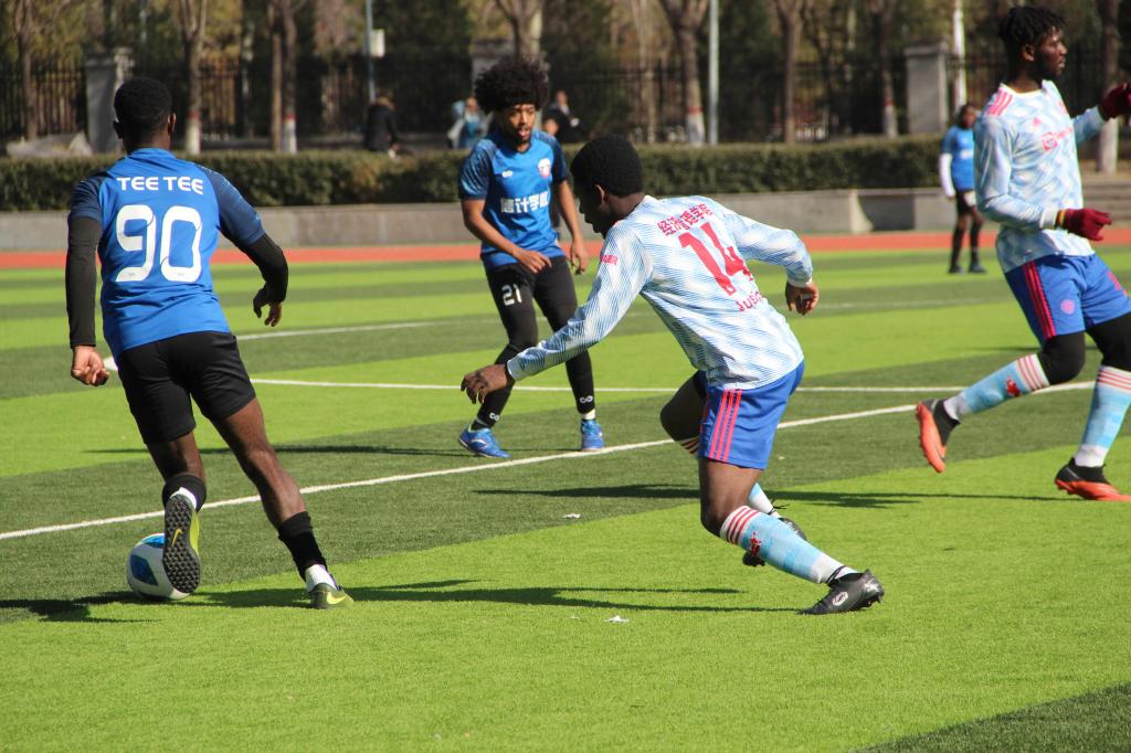 决赛于上午11点40分正式开始,双方球员在赛场上意气风发,精神十足。我院学子在观众席中为球员们加油鼓劲,我院运动员士气大涨。在上半场比赛中,面对对方发起地猛烈进攻,我院球员采取稳扎稳打的防守战术。球员们默契配合,在赛场上应对自如,趁势将比分拉至1:0。