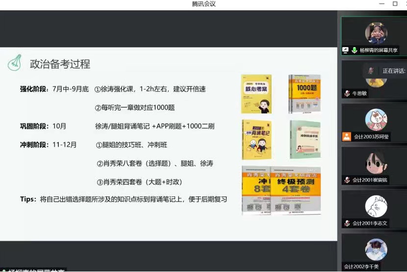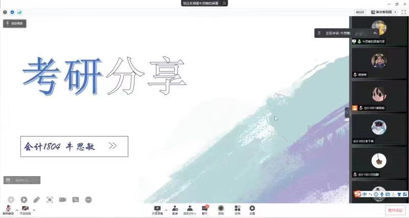 本学期讲坛共聘请2018级会计、国贸、工管、物流专业10名同学为“考研先锋”和“就业先锋”。从择校、备考、复试技巧到简历书写、简历投递、面试技巧,10位小讲师精心准备了分享内容,还就同学们提出的问题进行了答疑,就同学们感兴趣的话题进行了交流。