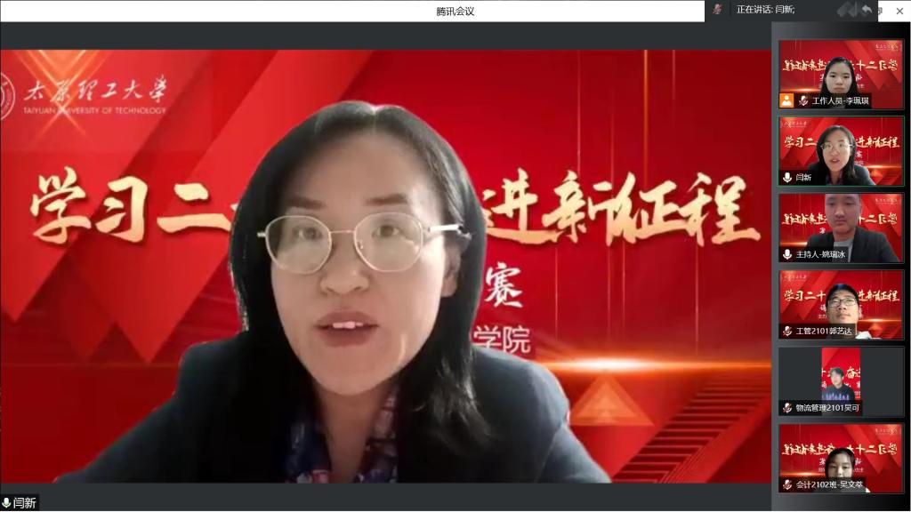 最终,经过激烈比拼,会计2102团支部获得一等奖,会计2103、国贸2101等两个支部获得二等奖,工管2103、工管2102、物流2101等三个支部获得三等奖。赛后,大赛特邀评委、学生处思想政治教育科科长陈冬华老师作了精彩点评,她充分肯定了参赛选手的良好表现,希望同学们更加深入学习党的二十大精神,落实到实际行动中以报效祖国。闫新希望同学们能结合个人特点和专业特性学好党的二十大精神,并对团支部建设和学院未来发展提出殷切期望。