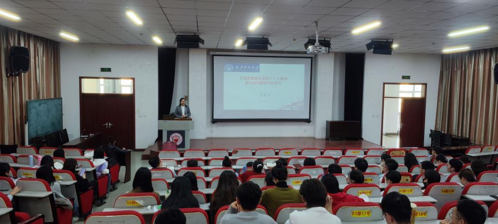 3月29日下午,350vip8888新葡的京集团在学院报告厅举行党的二十大精神宣讲暨形势政策报告会,马克思主义学院院长刘振霞教授主讲,350vip8888新葡的京集团党委书记闫新出席报告会,全体在校研究生参加此次报告会。