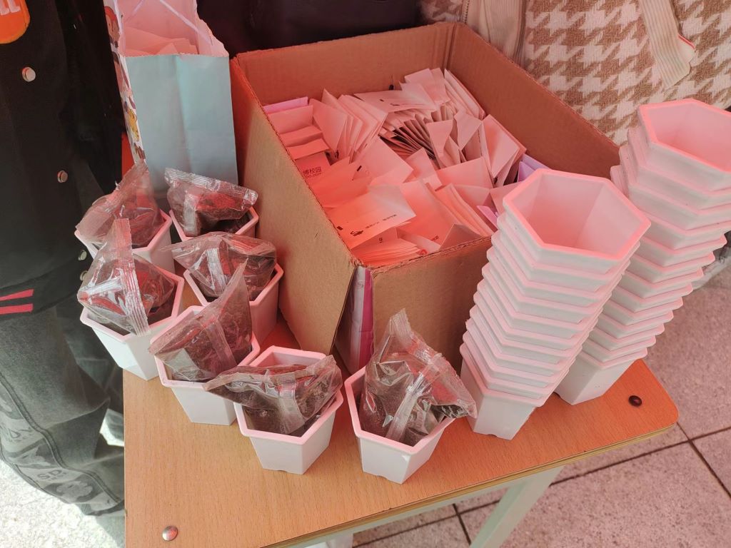 在活动现场,志愿者引导参加活动的同学们转发绿植领养话题,领取绿植、种植用土及花盆,参与的同学可以从小麦、满天星、草莓等绿植种子中挑选一份自己喜爱的来领养。同学们细心询问了相关绿植的养育方法并认真地听取志愿者细致的讲解。活动还设置了抽奖和游戏环节,趣味满满的套圈、精彩绝伦的知识竞答以及精美的礼品更是激起大家参与活动的热情。同学们在领养绿植、参与环保活动的同时,也充分体验到游戏的乐趣。在生机盎然的四月春景下,领养的绿植也蕴含着同学们对生命价值和希望的追寻。