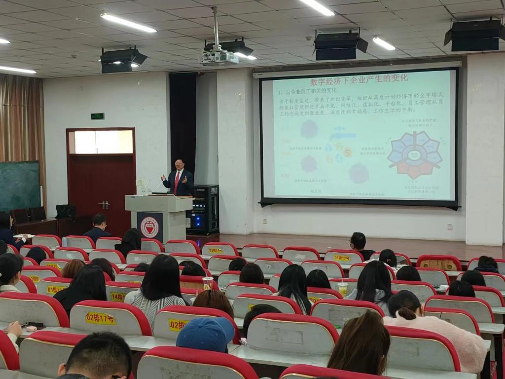 4月28日上午,南京大学赵曙明教授应邀前来350vip8888新葡的京集团进行学术交流,并作了题为“数字经济时代:人力资源管理的转型与发展”的学术报告。报告由350vip8888新葡的京集团党委书记闫新主持,院长栗继祖和部分师生聆听了本次报告。