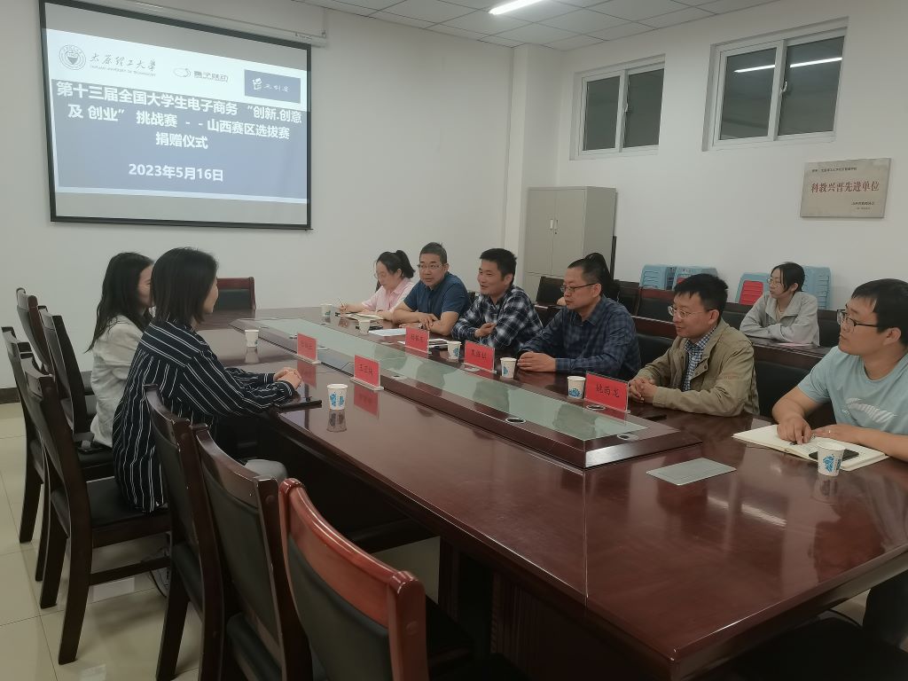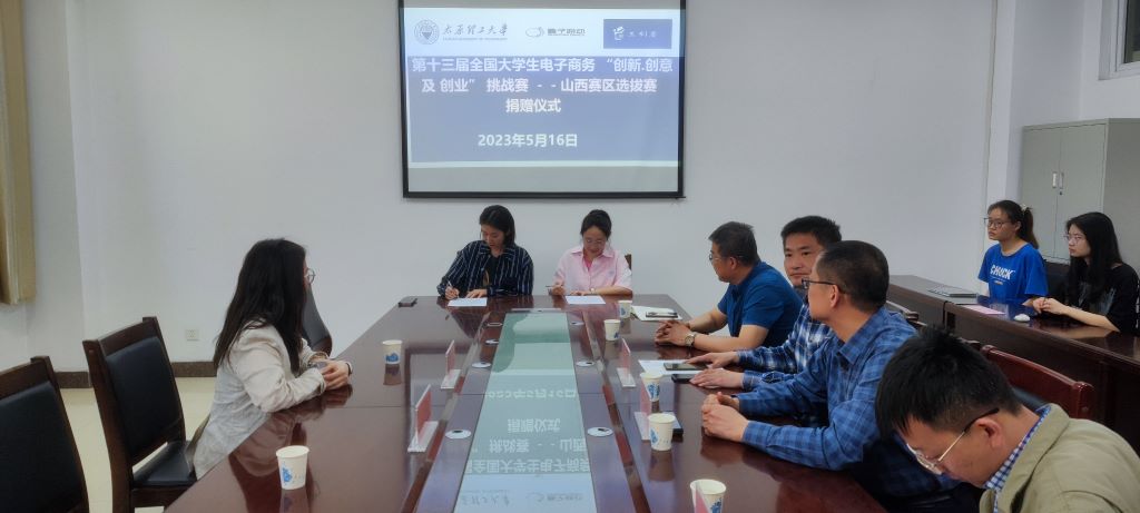 5月16日上午,350vip8888新葡的京集团创新创意及创业素质教育中心及科技竞赛基地在学院226会议室举行第十三届全国大学生电子商务“创新、创意及创业”挑战赛山西赛区选拔赛捐赠仪式。今日头条山西创作空间总经理王亚楠,万柏林区政府楼宇办程娅妘,院长栗继祖,院党委副书记杨振东,副院长姚西龙,山西省“三创赛”负责人温芝龙,学工办副主任张志卿,辅导员王戎以及院科协学生代表参加捐赠仪式。